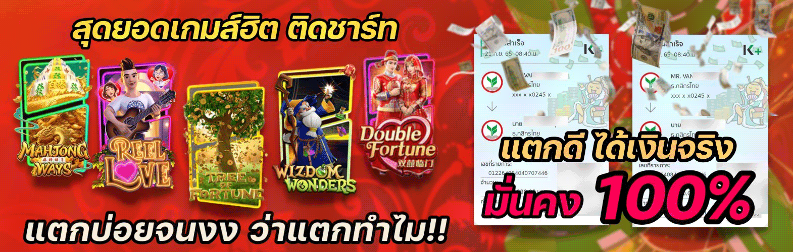 ระบบของเราทำงานร่วมกับธนาคารชั้นนำของไทยหลายแห่ง ทำให้คุณสามารถเลือกใช้บริการผ่านธนาคารที่คุณสะดวกได้ ไม่ว่าจะเป็นการโอนผ่านแอพมือถือ อินเทอร์เน็ตแบงก์กิ้ง หรือตู้ ATM การฝากเงินใช้เวลาเพียง 3-5 วินาทีเท่านั้น ส่วนการถอนเงินก็รวดเร็วไม่แพ้กัน โดยปกติจะได้รับเงินภายใน 1 นาที